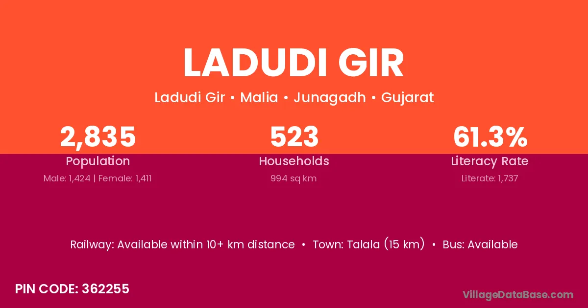 Talala (15 km) is the nearest town to Ladudi Gir village for major economic activities and is located approximately 15 km away.
