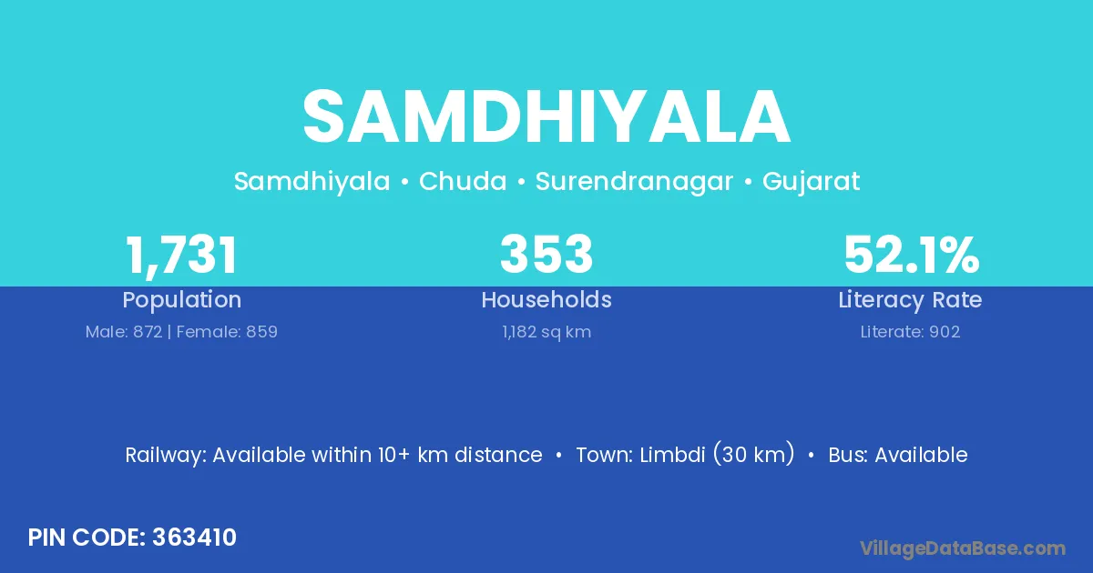 Chorvad (17 km) is the nearest town to Samdhiyala village for major economic activities and is located approximately 17 km away.