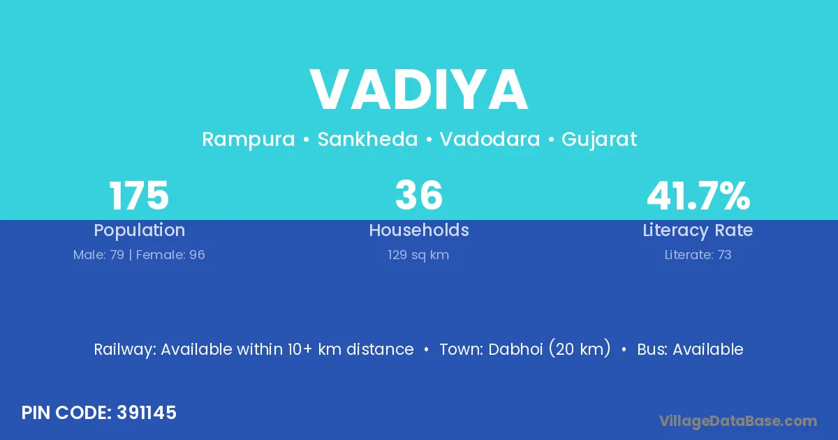 Keshod (35 km) is the nearest town to Vadiya village for major economic activities and is located approximately 35 km away.