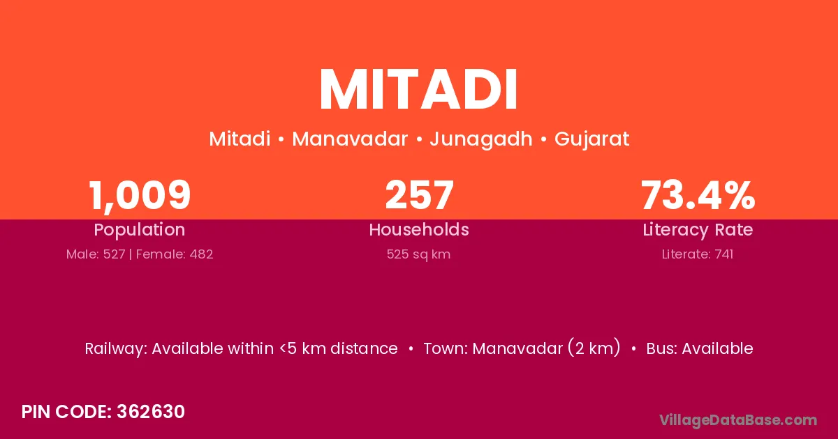 Manavadar (2 km) is the nearest town to Mitadi village for major economic activities and is located approximately 2 km away.