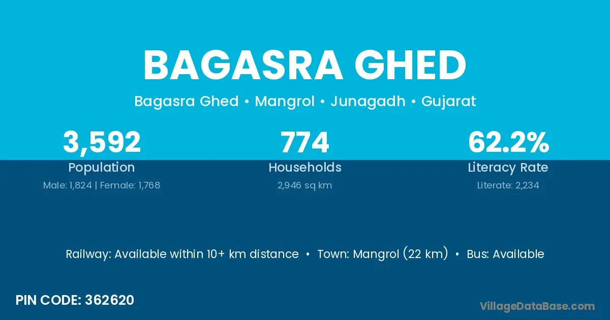 Mangrol (22 km) is the nearest town to Bagasra Ghed village for major economic activities and is located approximately 22 km away.