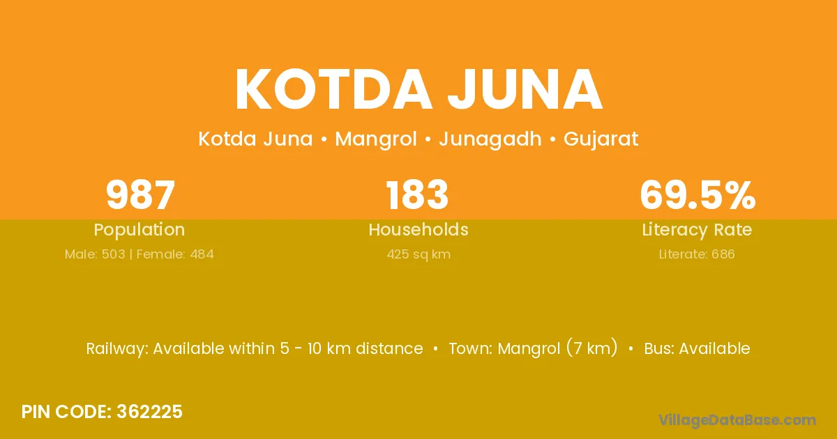 Mangrol (7 km) is the nearest town to Kotda Juna village for major economic activities and is located approximately 7 km away.