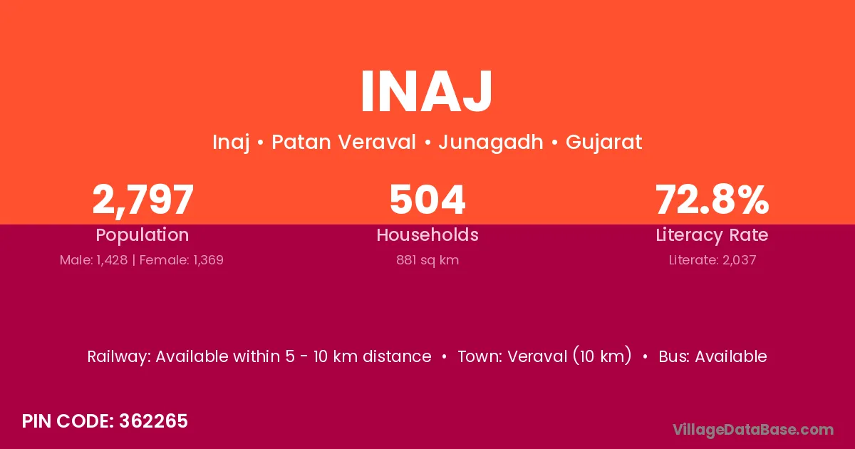 Veraval (10 km) is the nearest town to Inaj village for major economic activities and is located approximately 10 km away.