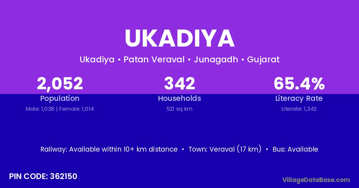 Veraval (17 km) is the nearest town to Ukadiya village for major economic activities and is located approximately 17 km away.