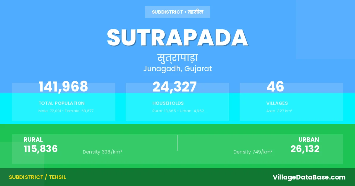 According to the 2011 census The total area of Sutrapada Taluka is 327 km², with a population of 141968 people. The population density is 434 inhabitants per square kilometre, and there are approximately 24327 houses in the sub district.