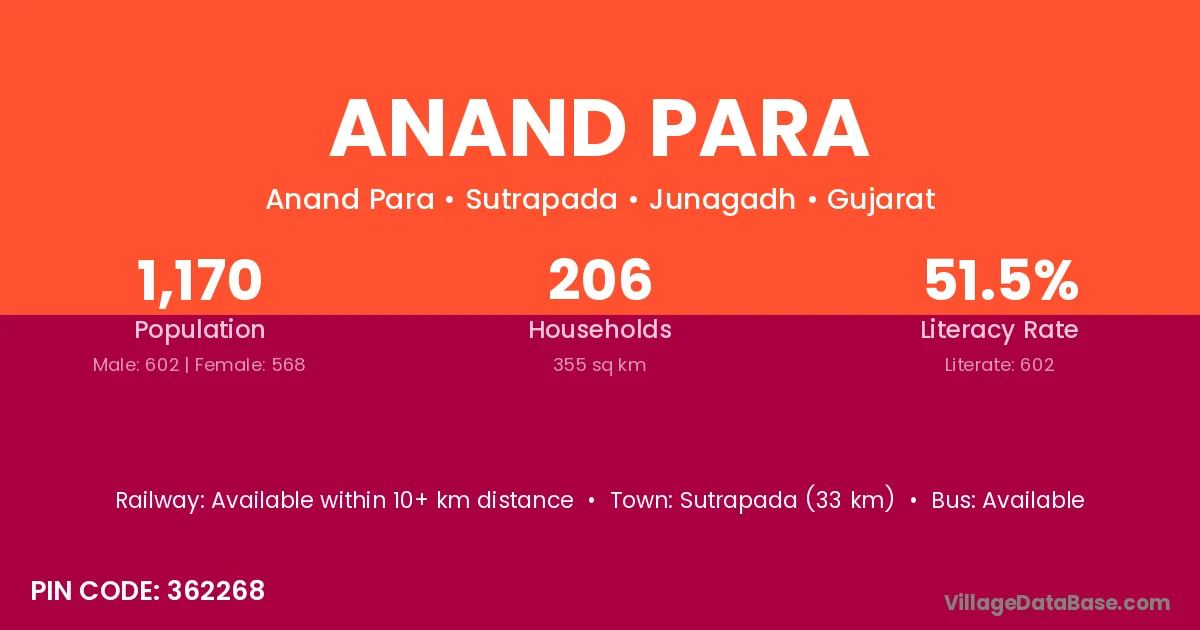 Sutrapada (33 km) is the nearest town to Anand Para village for major economic activities and is located approximately 33 km away.