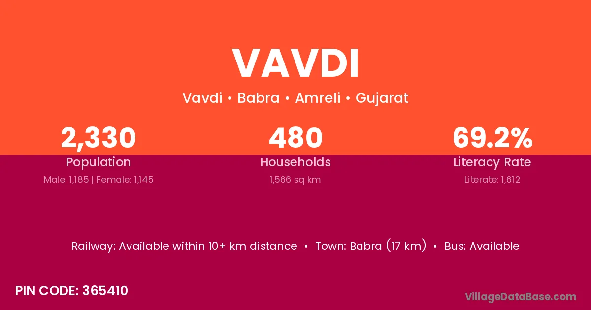 Sutrapada (6 km) is the nearest town to Vavdi village for major economic activities and is located approximately 6 km away.