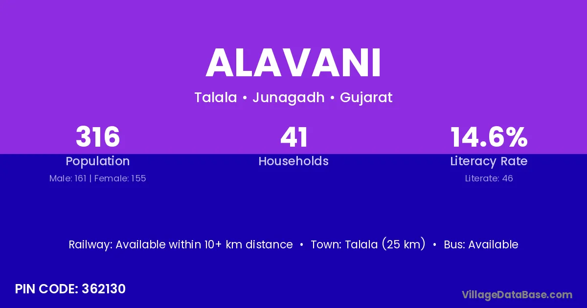 Talala (25 km) is the nearest town to Alavani village for major economic activities and is located approximately 25 km away.