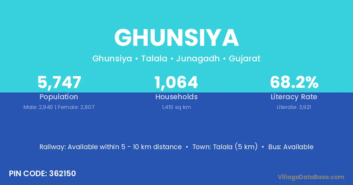 Talala (5 km) is the nearest town to Ghunsiya village for major economic activities and is located approximately 5 km away.
