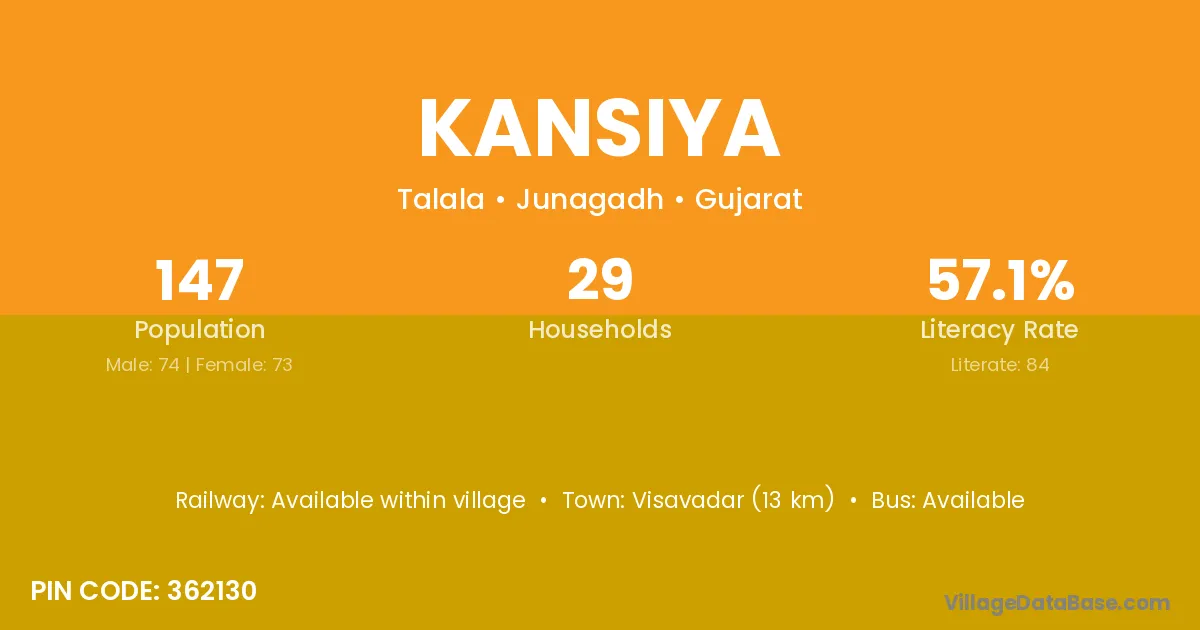 Visavadar (13 km) is the nearest town to Kansiya village for major economic activities and is located approximately 13 km away.