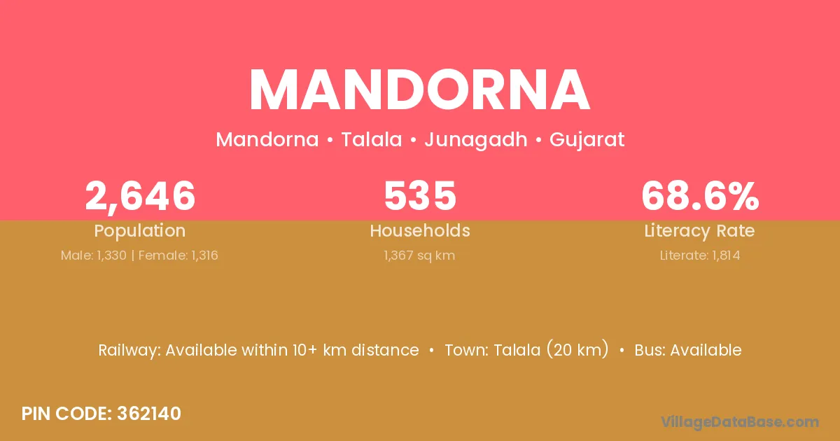 Talala (20 km) is the nearest town to Mandorna village for major economic activities and is located approximately 20 km away.