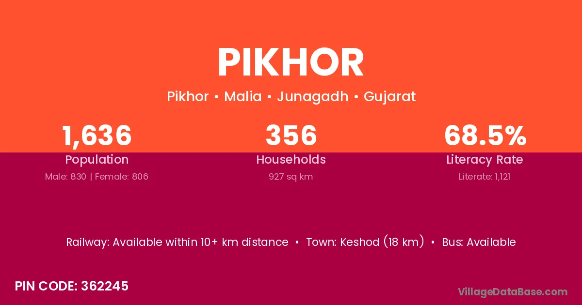 Kodinar (17 km) is the nearest town to Pikhor village for major economic activities and is located approximately 17 km away.