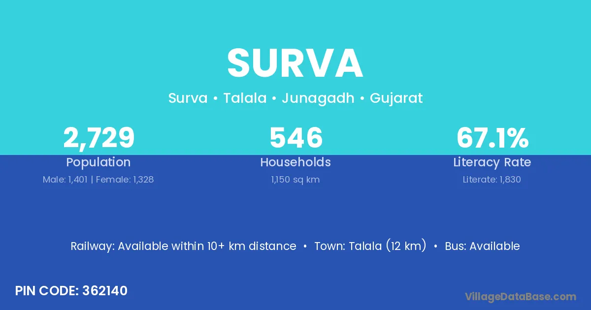 Talala (12 km) is the nearest town to Surva village for major economic activities and is located approximately 12 km away.