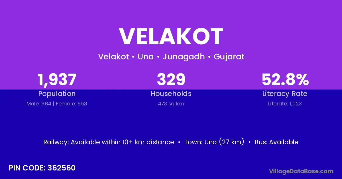 Velakot village has a total population of 1,937 people, of which 984 are males and 953 are females.