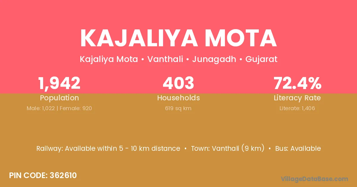 Vanthali (9 km) is the nearest town to Kajaliya Mota village for major economic activities and is located approximately 9 km away.