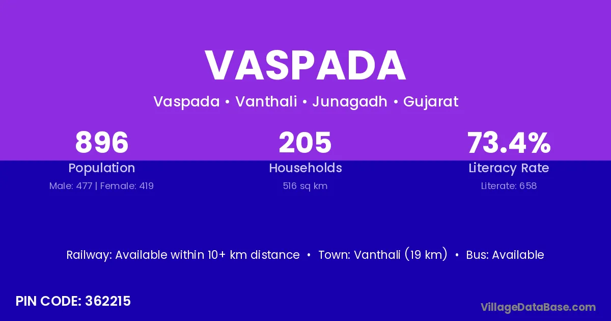 Vanthali (19 km) is the nearest town to Vaspada village for major economic activities and is located approximately 19 km away.