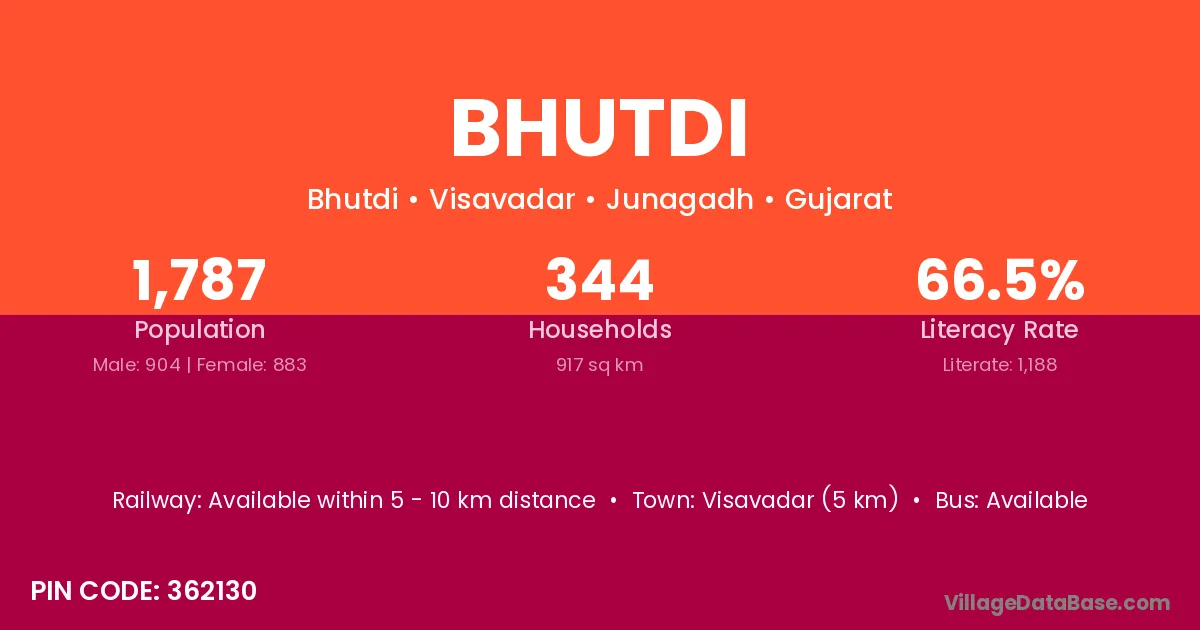 Visavadar (5 km) is the nearest town to Bhutdi village for major economic activities and is located approximately 5 km away.