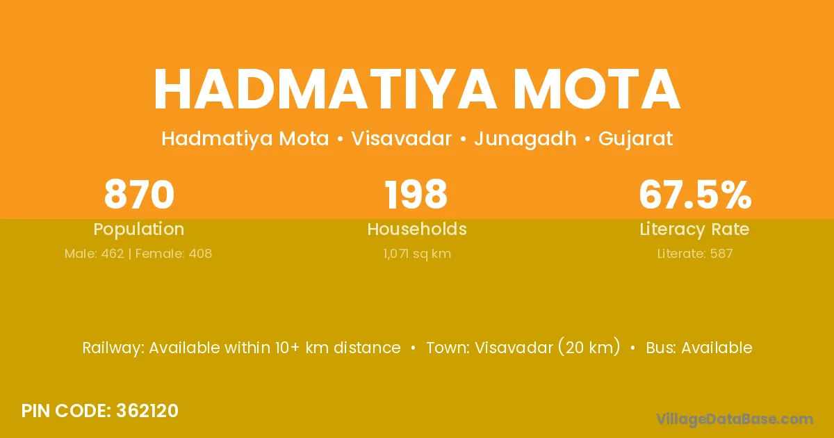 Visavadar (20 km) is the nearest town to Hadmatiya Mota village for major economic activities and is located approximately 20 km away.