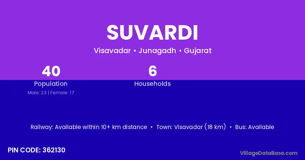 Visavadar (18 km) is the nearest town to Suvardi village for major economic activities and is located approximately 18 km away.