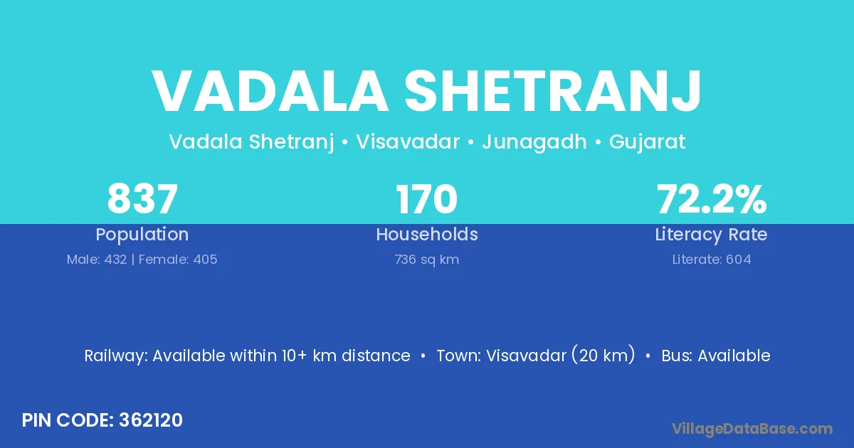 Visavadar (20 km) is the nearest town to Vadala Shetranj village for major economic activities and is located approximately 20 km away.