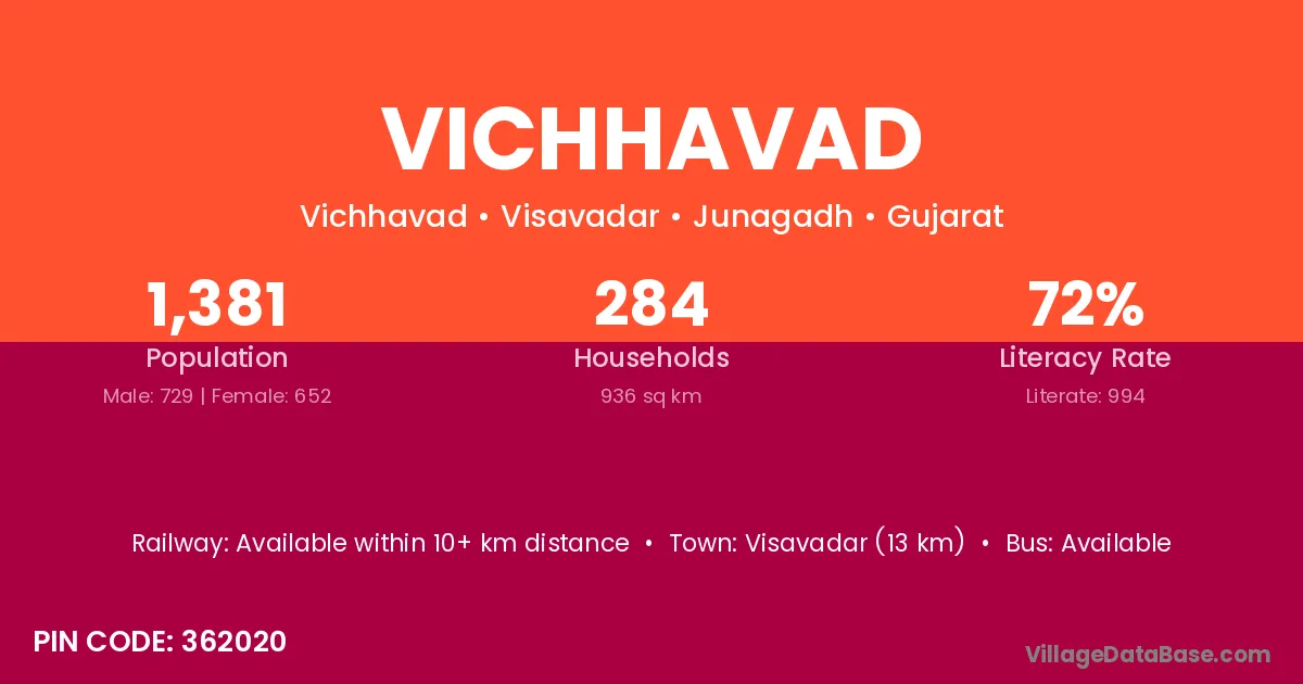 Visavadar (13 km) is the nearest town to Vichhavad village for major economic activities and is located approximately 13 km away.