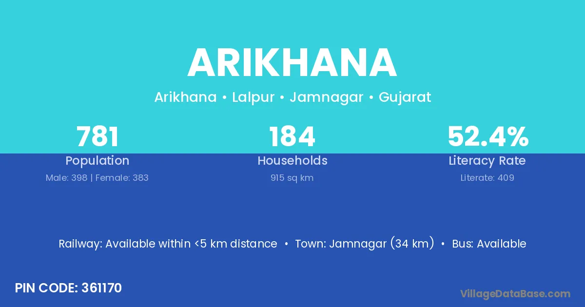 Bhuj (83 km) is the nearest town to Arikhana village for major economic activities and is located approximately 83 km away.
