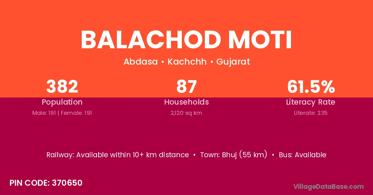 Bhuj (55 km) is the nearest town to Balachod Moti village for major economic activities and is located approximately 55 km away.