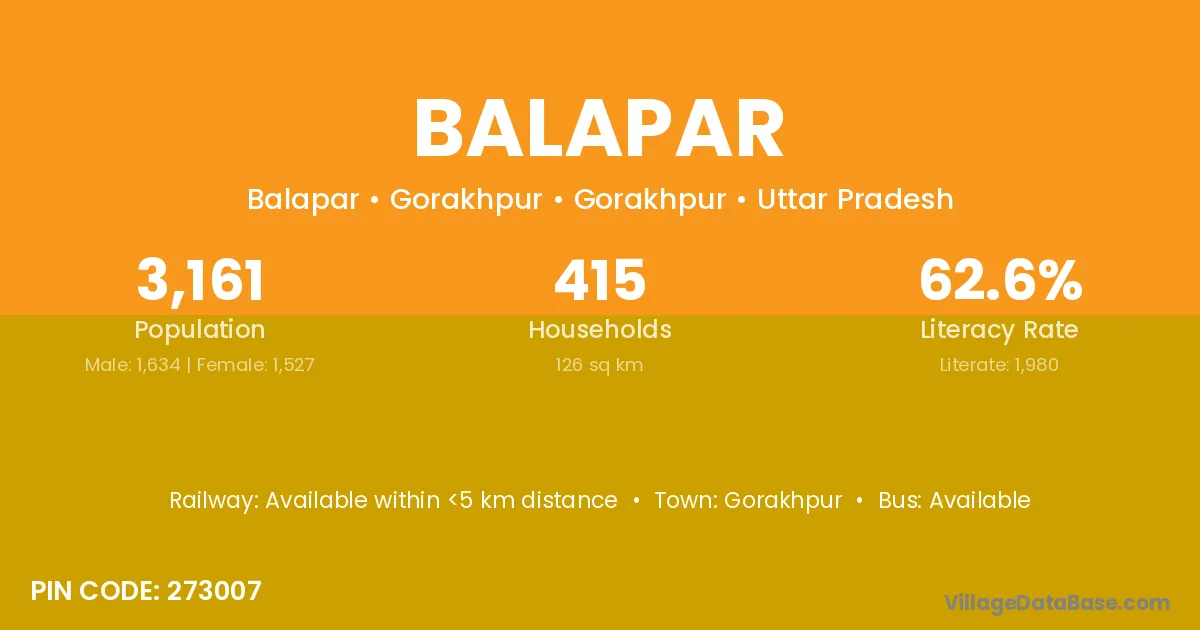 The literacy rate of Balapar village is 62.71%. Male literacy stands at 71.43% and female literacy at 54.84%.