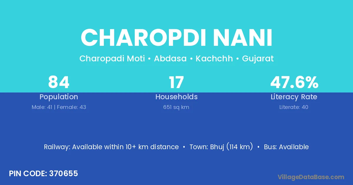 Bhuj (114 km) is the nearest town to Charopdi Nani village for major economic activities and is located approximately 114 km away.