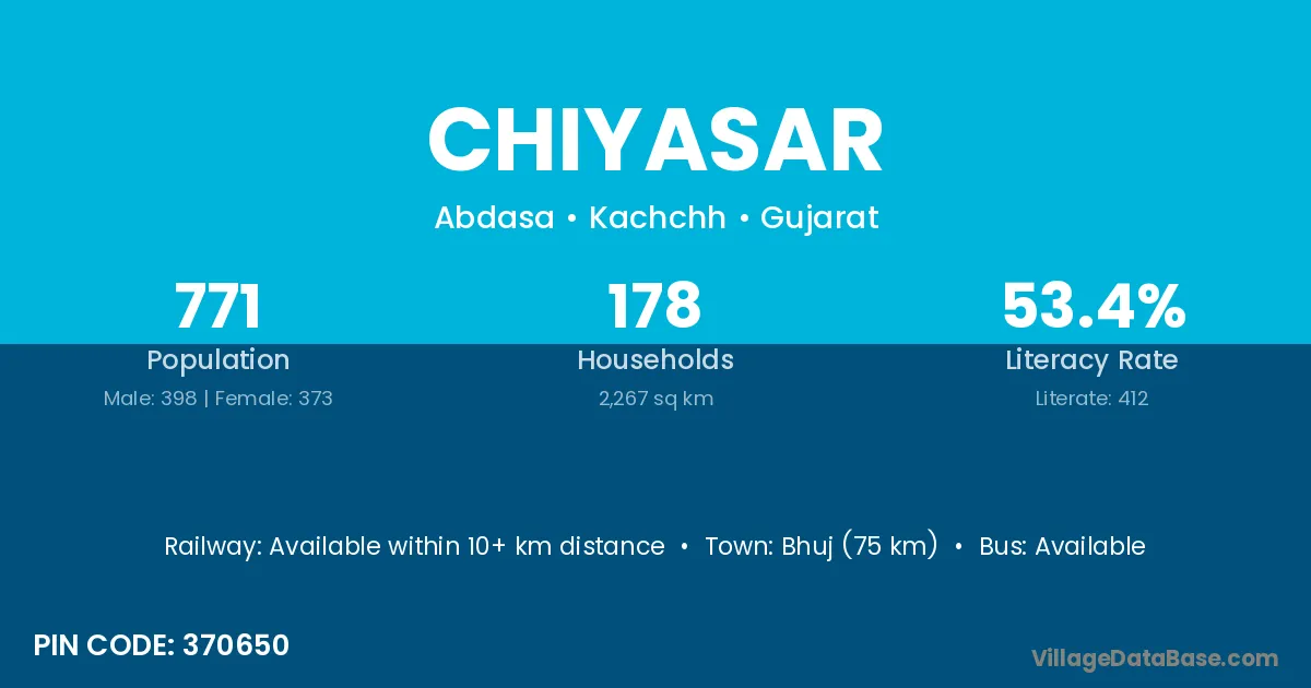 Bhuj (75 km) is the nearest town to Chiyasar village for major economic activities and is located approximately 75 km away.
