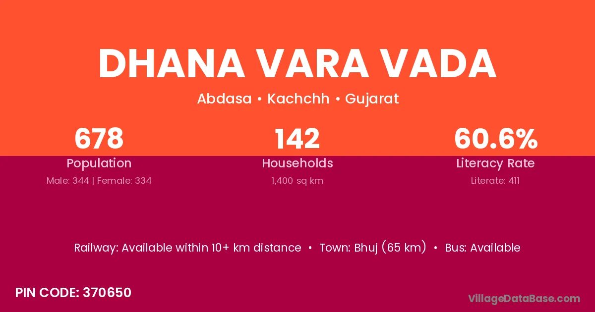 Bhuj (65 km) is the nearest town to Dhana Vara Vada village for major economic activities and is located approximately 65 km away.