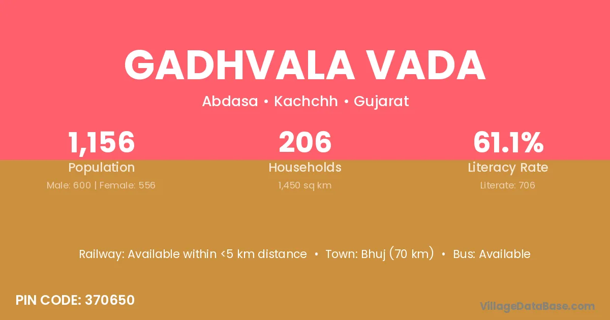 Bhuj (70 km) is the nearest town to Gadhvala Vada village for major economic activities and is located approximately 70 km away.
