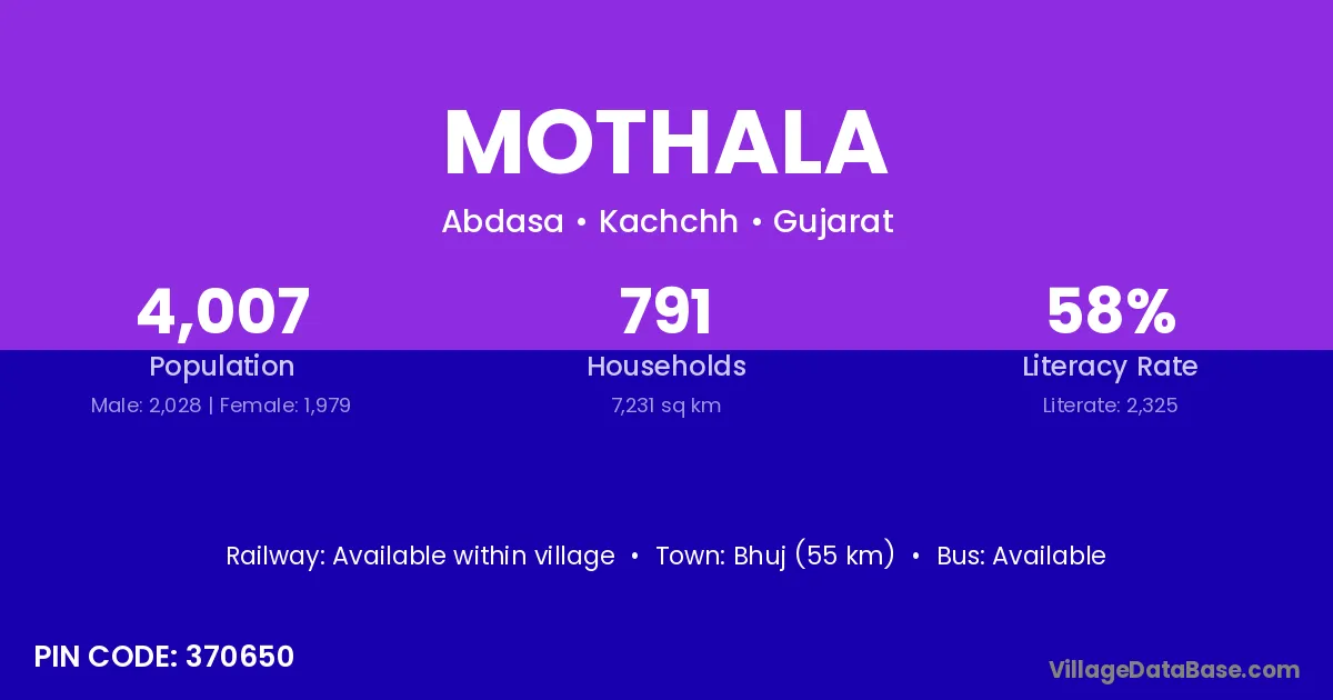 Bhuj (55 km) is the nearest town to Mothala village for major economic activities and is located approximately 55 km away.