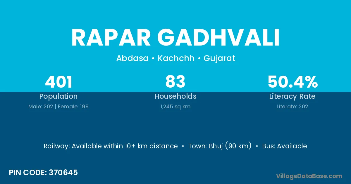 Rapar Gadhvali village has a total population of 401 people, of which 202 are males and 199 are females.