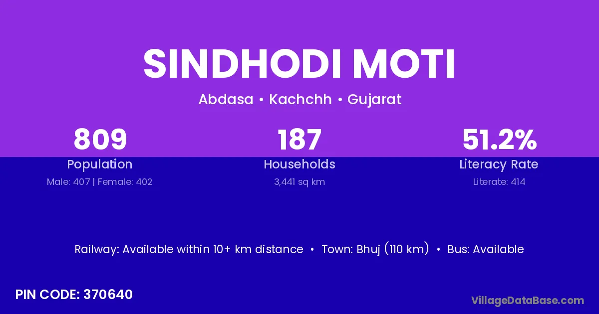 Sindhodi Moti village has a total population of 809 people, of which 407 are males and 402 are females.