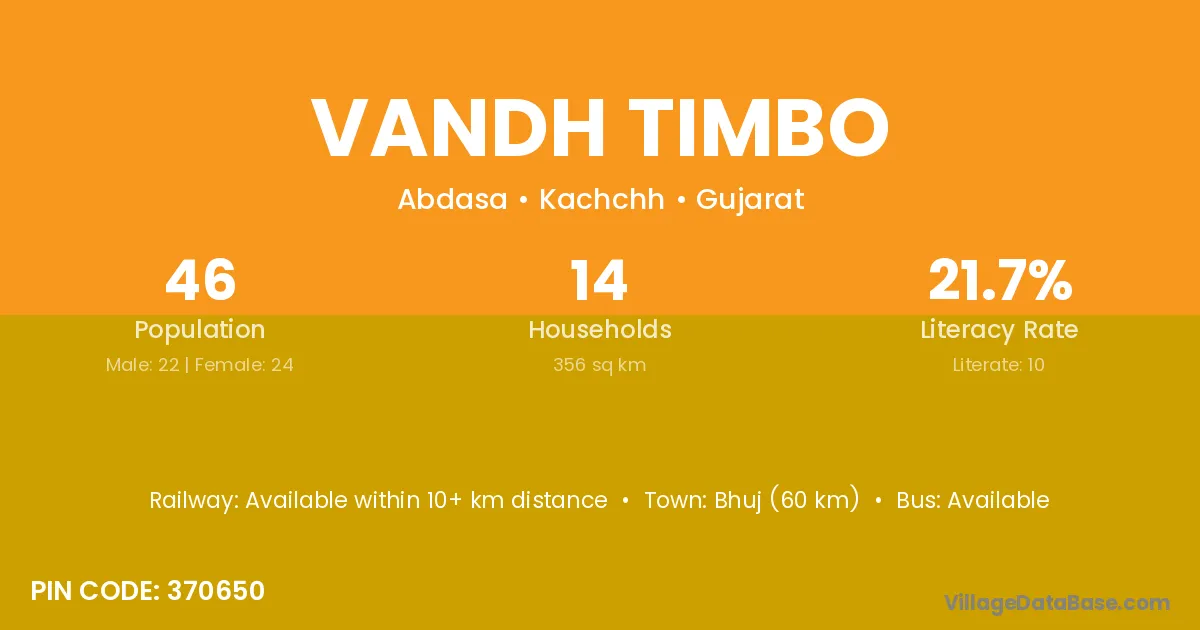 Bhuj (60 km) is the nearest town to Vandh Timbo village for major economic activities and is located approximately 60 km away.