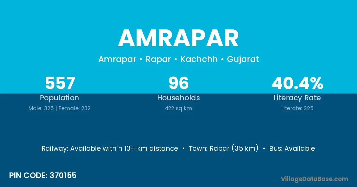 Anjar (38 km) is the nearest town to Amrapar village for major economic activities and is located approximately 38 km away.