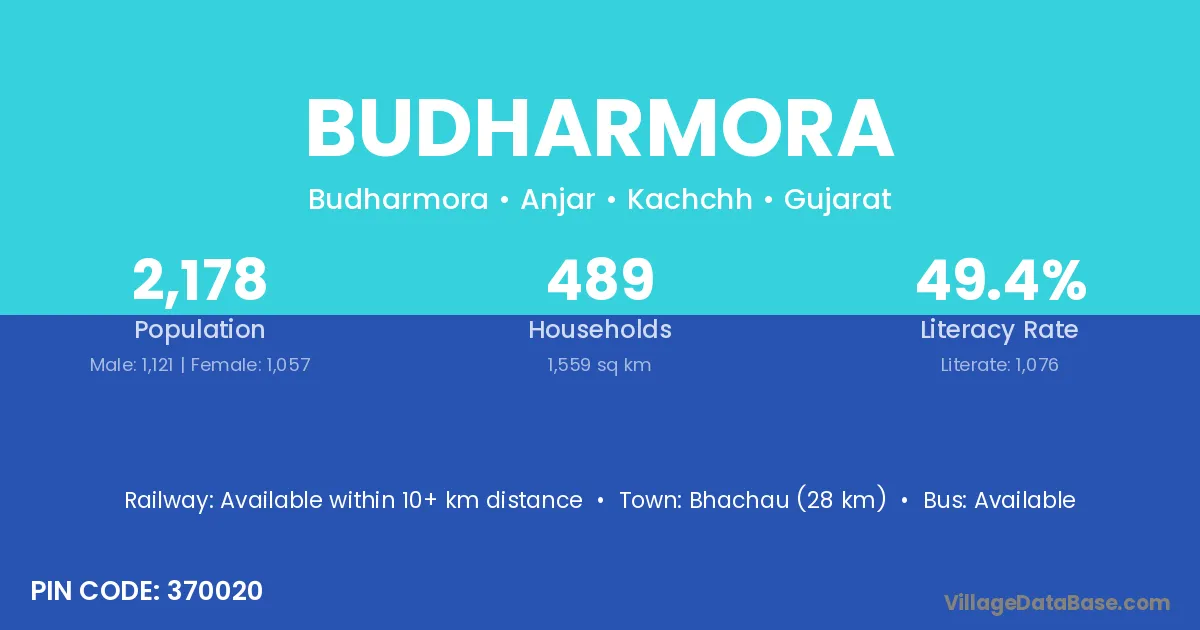 Bhachau (28 km) is the nearest town to Budharmora village for major economic activities and is located approximately 28 km away.