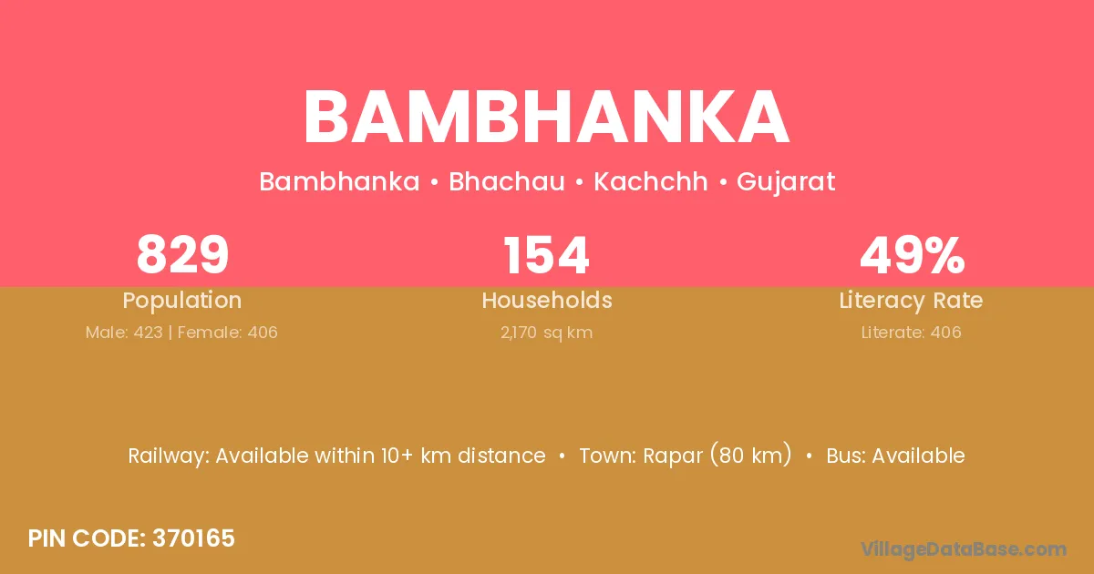 Rapar (80 km) is the nearest town to Bambhanka village for major economic activities and is located approximately 80 km away.