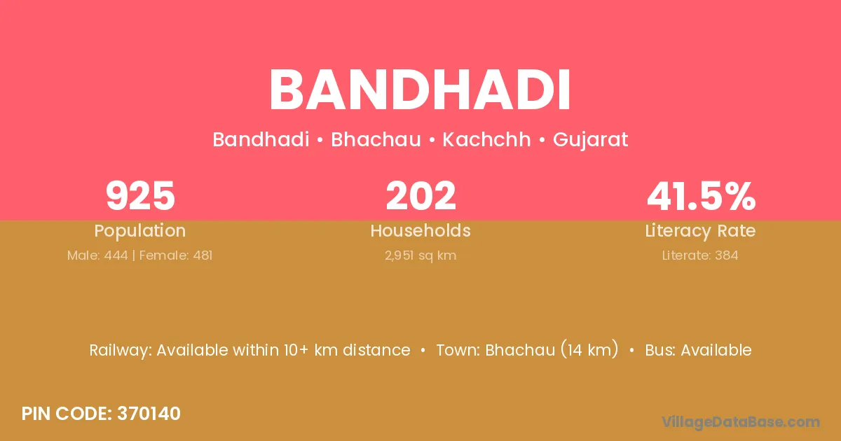 Bhachau (14 km) is the nearest town to Bandhadi village for major economic activities and is located approximately 14 km away.