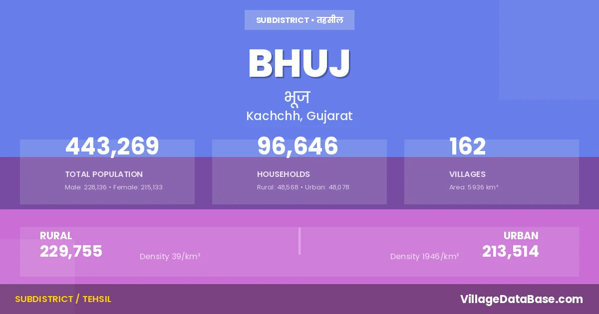 According to the 2011 census The total area of Bhuj Taluka is 5936 km², with a population of 443269 people. The population density is 75 inhabitants per square kilometre, and there are approximately 96646 houses in the sub district.