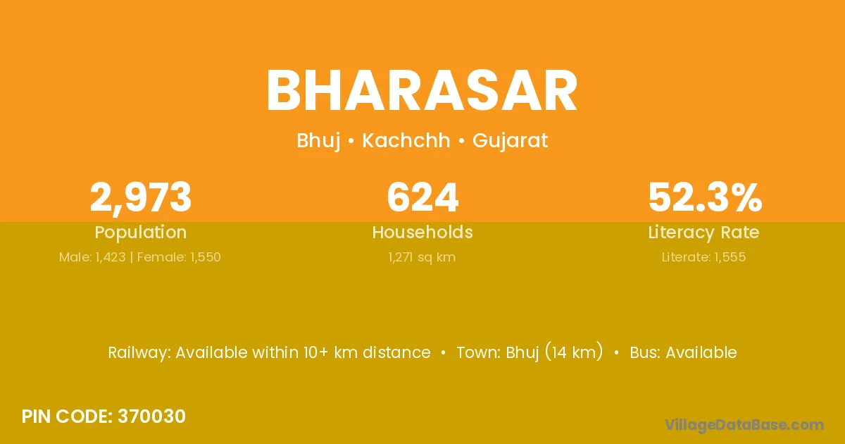 Bhuj (14 km) is the nearest town to Bharasar village for major economic activities and is located approximately 14 km away.