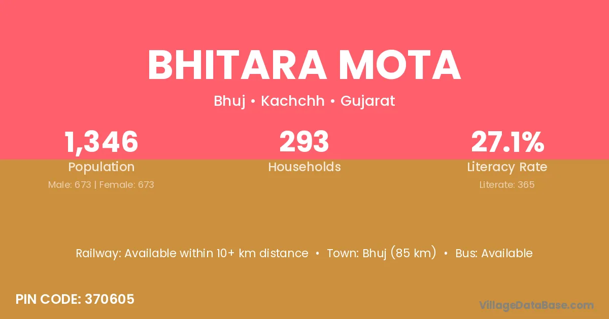 Bhuj (85 km) is the nearest town to Bhitara Mota village for major economic activities and is located approximately 85 km away.