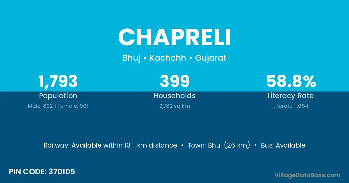 Bhuj (26 km) is the nearest town to Chapreli village for major economic activities and is located approximately 26 km away.