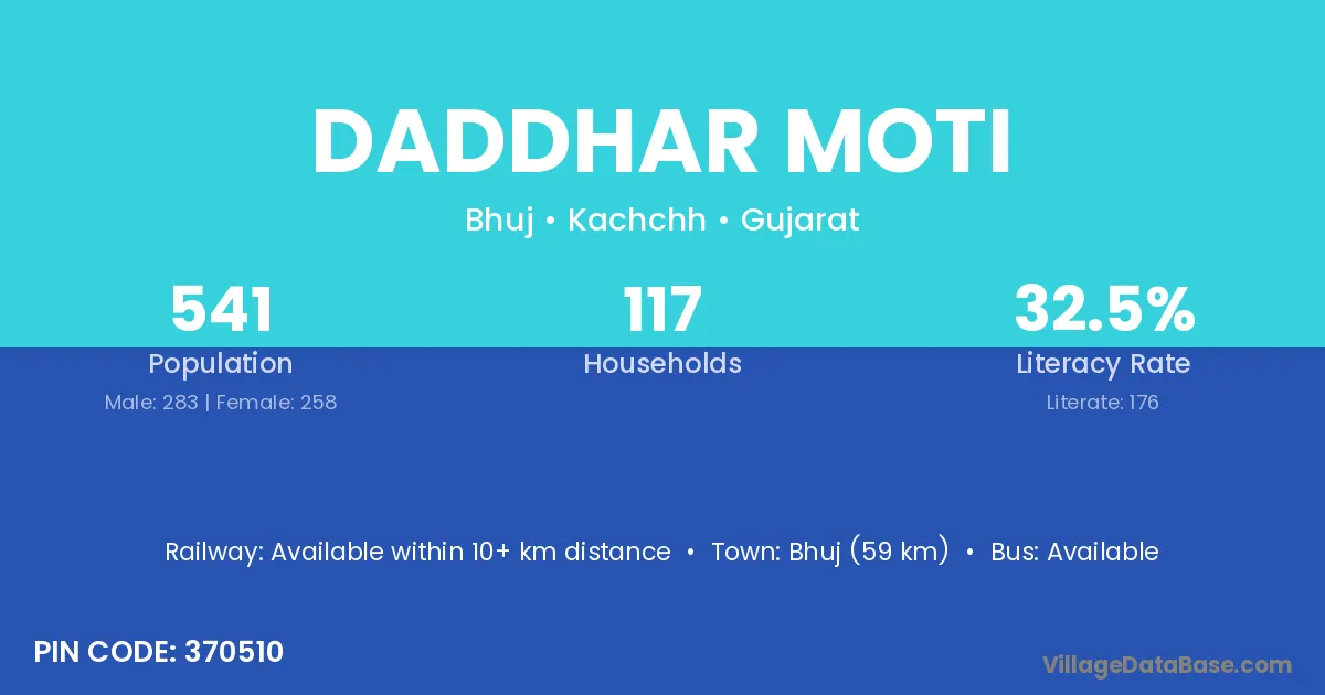 Bhuj (59 km) is the nearest town to Daddhar Moti village for major economic activities and is located approximately 59 km away.