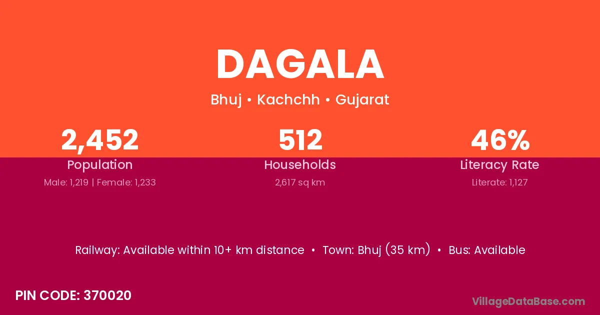 Bhuj (35 km) is the nearest town to Dagala village for major economic activities and is located approximately 35 km away.