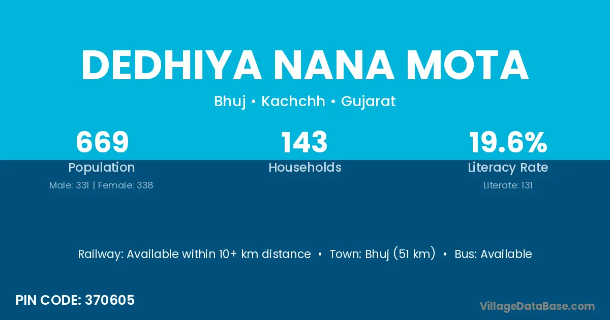 Dedhiya Nana Mota village has a total population of 669 people, of which 331 are males and 338 are females.