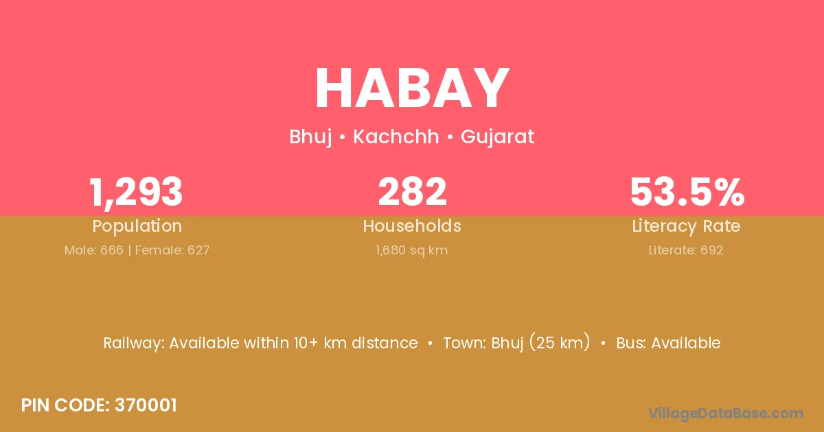 Bhuj (25 km) is the nearest town to Habay village for major economic activities and is located approximately 25 km away.