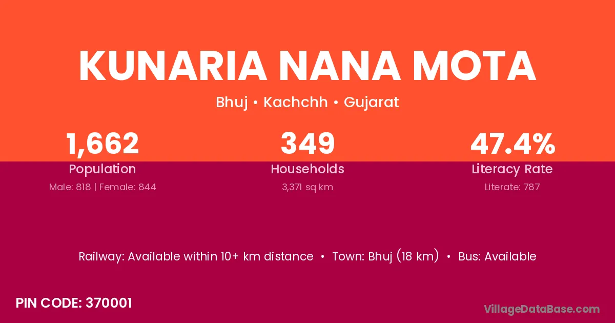 Bhuj (18 km) is the nearest town to Kunaria Nana Mota village for major economic activities and is located approximately 18 km away.