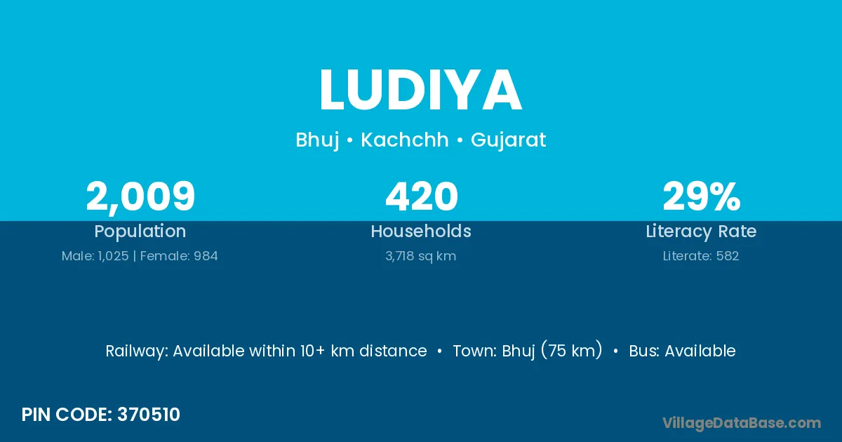 Bhuj (75 km) is the nearest town to Ludiya village for major economic activities and is located approximately 75 km away.